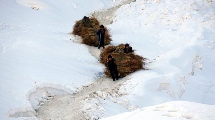Çiftçiler, kızaklara ve brandalara yükledikleri otları, kar kalınlığının yer yer 1 metreyi bulduğu bölgede, zorlu yolculuğun ardından köye ulaştırıp, hayvanlarına yediriyor.