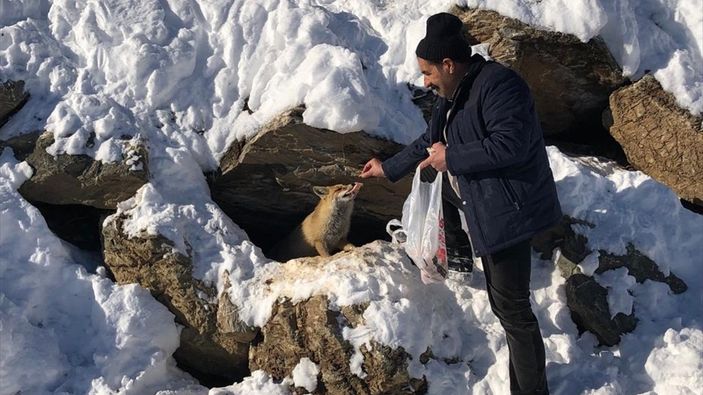 Hakkari’nin Durankaya beldesi yolunda çalışma yürüten karla mücadele ekipleri, beyaz örtüyle kaplanan doğada yiyecek bulamayan ve kayalık bölgede bitkin düşen tilkiyi gördü.