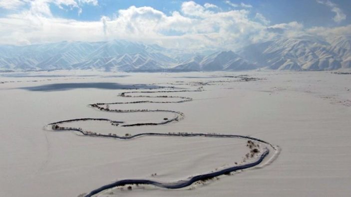 Hakkari'nin Yüksekova ilçesinde dümdüz ovasının içinde kıvrılarak uzayan menderesler, etrafını saran karlı dağlarla görsel şölen sunuyor.