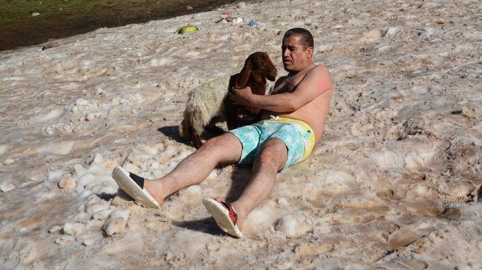 Hakkari Valiliği öncülüğünde Cilo Dağları’ndaki Sat Buzul Gölleri’nde bu yıl 4.’sü düzenlenen Doğa Sporları Festivali'ne katılan türkücü Aydın Aydın da kuzusu ile birlikte kar banyosu yapanların arasında yer aldı.