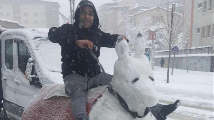 Hakkarili esnaf, kar yağışından dolayı iş yoğunluğu azalınca kardan eşek yapıp bindi.