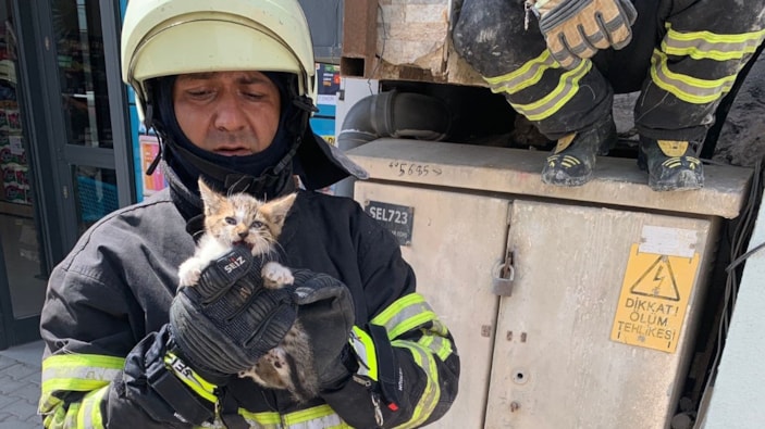 Kısa sürede bölgeye gelen itfaiye ekipleri, duvarı kırarak hummalı çalışmayla kediyi kurtardılar.