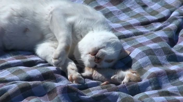 Sokak kedisinin ölen yavrusunu ağzına alıp, parktaki kilime bıraktıktan sonra üzerine kapanıp tüylerini yalaması görenleri duygulandırdı.