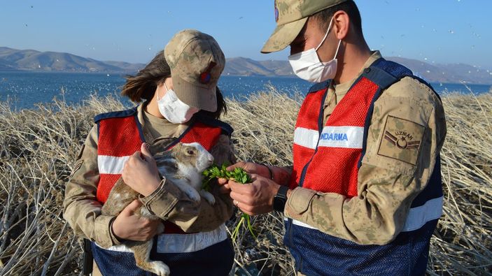 Hazar Gölü adacığındaki tavşanlara jandarma bakıyor