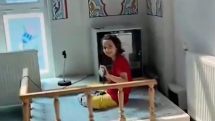 Sesi açık olan mikrofona mırıldanan küçük kızın, hocanın ezan okumasına özendiği görülüyor.
