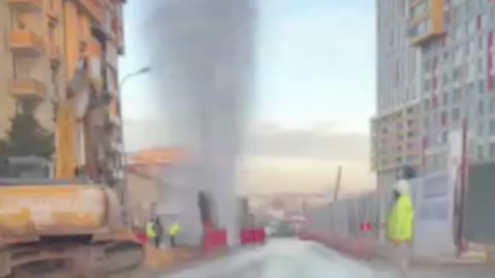 Kadıköy'de sokakta ekipler çalışma yaptığı sırada iş makinesinin su borusunu patlatması sonucu su metrelerce yukarıya fışkırdı.