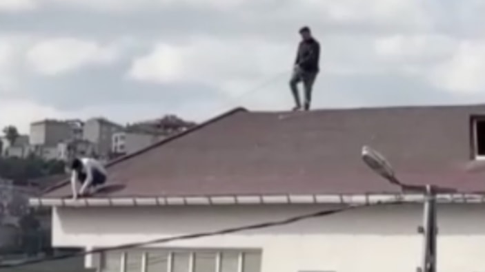 Başakşehir'de tamirat için çatıya çıkan gençlerden birinin, beline bağlanan iple güvenlik önlemi alınması yürekleri ağızlara getirdi.