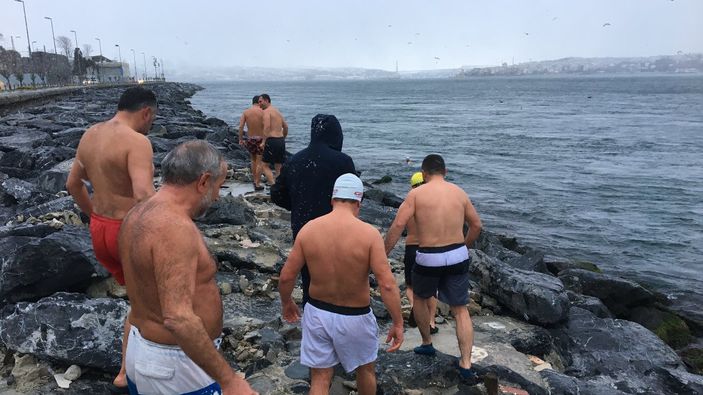 Yoğun kar yağışının etkisini gösterdiği İstanbul'da bir grup arkadaş, Sarayburnu sahilinde soğuk havaya aldırış etmeden deniz keyfi yaptı.
