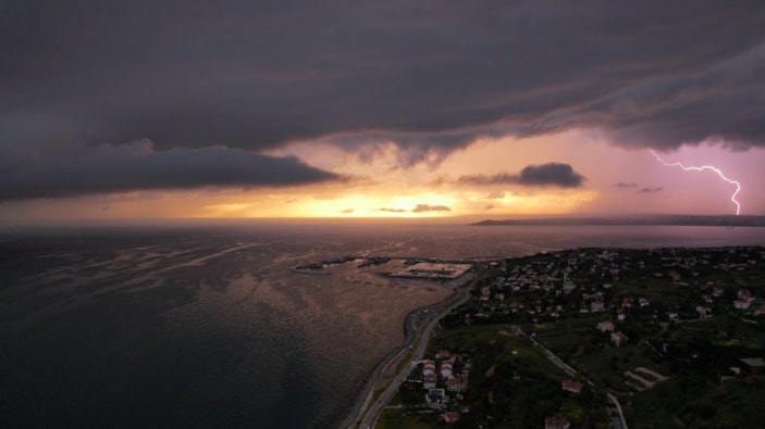 Gün batımı, raf bulutu ve yıldırım ise aynı anda havadan çekilen görüntülere yansıdı.