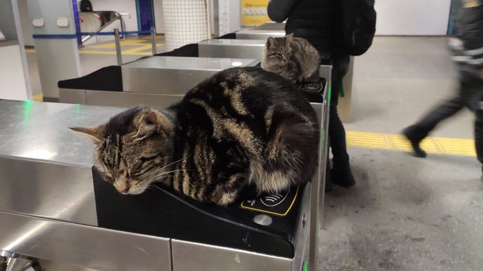 Metroya binmek için akbil kullanan vatandaşların, kedileri rahatsız etmeden turnikeleri kullandığı görüldü.