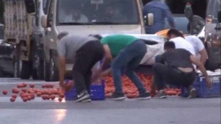 Domatesleri yola savrulan seyyar satıcıya vatandaşlar yardım etti ViDEO