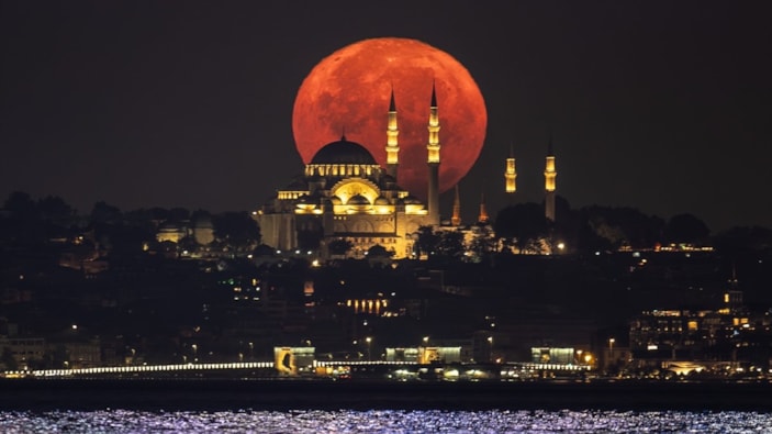 İstanbul'da dolunay ve Süleymaniye Camii ile birlikte eşsiz görüntüler ortaya çıktı.