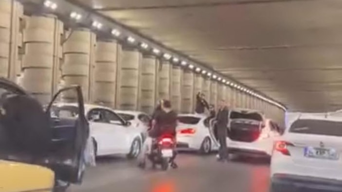 Konvoydaki araçların alt geçitteki iki şeridi birden kapatması, yoldan geçen diğer sürücüler tarafından cep telefonuyla görüntülendi.