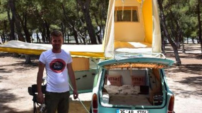 İzmir'de yaşayan ve oto elektrik ustası olan 35 yaşındaki Mehmet Ardil, çok sevdiği klasik otomobili hem çekici hem de arkasına taktığı çekme karavanda kullandı.