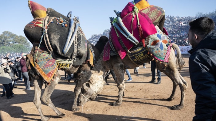 Selçuk Efes Kültür ve Turizm Vakfı tarafından Pamucak Güreş Sahası'nda düzenlenen etkinlikte, Ege, Akdeniz ve Marmara bölgelerinden 120 deve mücadele etti.