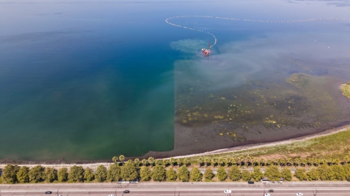 Büyükakın'ın paylaştığı fotoğrafta, dip çamurunun temizlendiği alanın mavi renge döndüğü, temizlenmeyen alanın ise gri ve kahverengi tonlarda kaldığı görüldü.