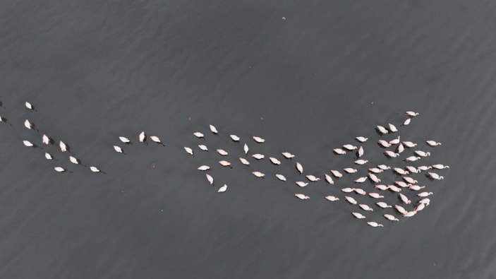 Kocaeli'nin kent manzarasıyla bütünleşen flamingoların oluşturduğu görsel şölen, havadan drone ile de görüntülendi.