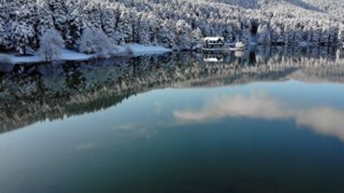 Bolu'ya yaklaşık 13 kilometre uzaklıkta bulunan Gölcük tabiat Parkı'nda, kar yağışıyla birlikte hayranlık uyandıran manzaralar oluştu.
