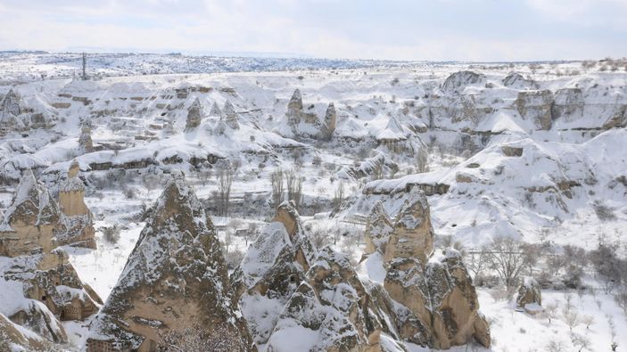 Türkiye'nin en önemli turizm merkezlerinden biri olan Kapadokya'da peribacaları da beyaz örtüyle kaplandı.