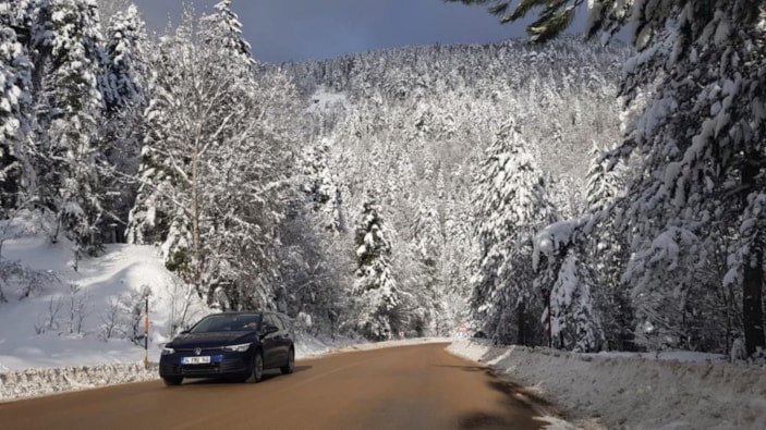 Beyaza bürünen orman ve kıvrımlı yollar drone ile görüntülendi.