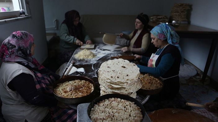 Ramazan'da tüketilen yufkanın yanı sıra börek, bazlama, erişte ve tatlı gibi yiyecekleri hazırlayan kadınlar, dayanışma ruhu sergiliyor.