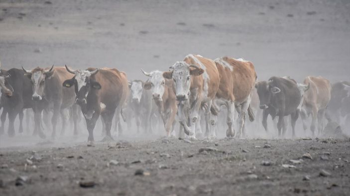 Kars'ta süt ineklerinin tozlu yolculuğu görüntülendi