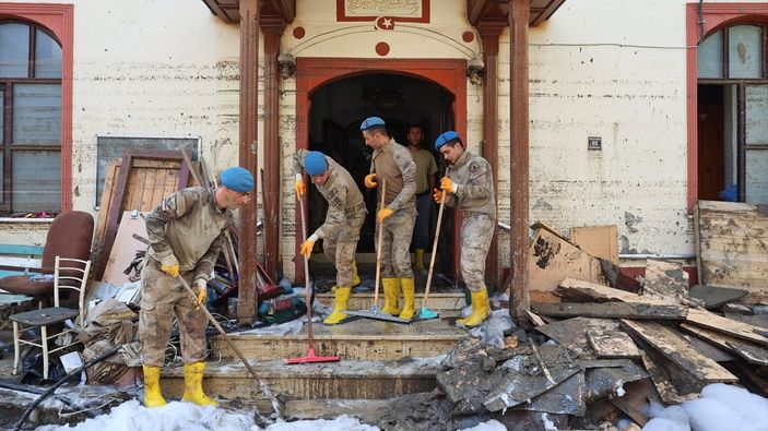 Komandolar, 11 Ağustos'ta yaşanan sel felaketinde sular altında kalan camideki çamur tabakasının temizlenmesinin ardından camiyi deterjan ve sabunla yıkadı.