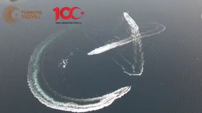 Balıkçı tekneleri denizde "ay yıldız ile 100. yıl" koreografisi oluşturdu.