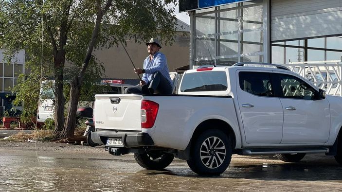 Bu durumu tiye almak isteyen metal işler esnafı, sabah iş yerine geldiğinde oluşan su birikintisi karşısında demirden yaptığı olta ve otomobil üzerinden çektiği balık tutma fotoğrafı ile kentteki altyapı sorununu eleştirdi.