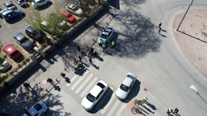 'Drone' destekli denetimlerde bazı sürücülerin kask ve sürücü ekipmanlarını taktıkları bazı sürücülerin ise kaskı motosikletin direksiyonunda bulundurduğu görüldü.