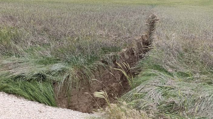 Karapınar ilçesinde yoğun yağmur yağışı sonrası tarlada yüzey yarığı oluştu. Tarla sahibi, tarlasında daha önce çatlaklıkların olduğunu belirterek, "Yoğun yağış sonrası çatlaklıklar büyüyüp, yaklaşık 100 metre uzunluğunda yarık oluştu." sözlerini kullandı.