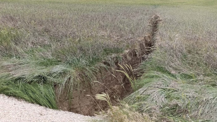 Kayalı Mahallesi Tilki Yaylasındaki tarlada, bugünkü yoğun yağış sonrası yüzey yarıkları oluştu.