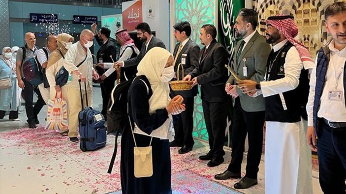 Türkiye'nin Riyad Büyükelçili'ğinin sosyal medya hesabından yapılan açıklamada, "Türkiye’den bu yıl gelen ilk hac kafilesi Medine’de çiçeklerle karşılandı." ifadelerine yer verildi.