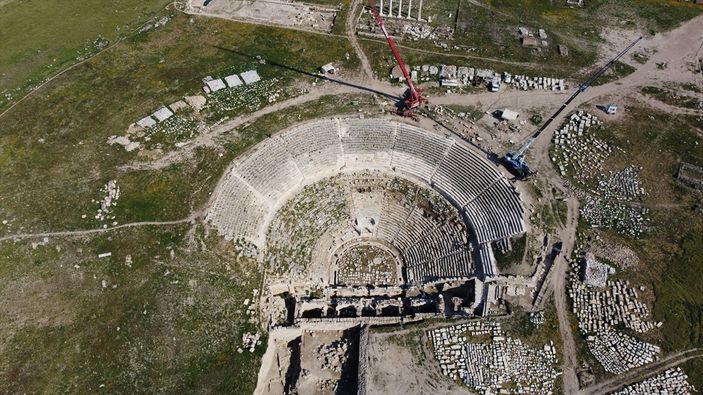 Koronavirüs salgını nedeniyle zaman zaman çalışmalarda aksamaların olduğunu ve bitiş tarihinin geciktiğini belirten Şimşek, "M.Ö. 2’nci yüzyılda yapılan tiyatro 3’üncü yüzyıldaki depremden sonra bir restorasyon geçirmiş. Burada 5’inci yüzyılın başında sahne binası, kentin sur duvarının bir parçası olarak kullanılmış. 96 metre çapındaki tiyatronun, seyircilerin oturduğu alt bölümü mermerden, üst bölümü ise travertenden yapılmış. Yaptığımız çalışmalarda özellikle alt oturma alanında bulunan mermer basamakların çoğunun kırılmış olduğunu fark ettik." dedi.