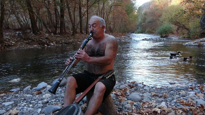 Doğu illerinin buz tuttuğu şu günlerde kulübesine kurduğu kuzine sobasında bir taraftan kumpir pişiren Aydın diğer taraftan da bir elinde klarneti diğerinde cümbüşüyle türkü söyleyerek temiz hava ve doğanın tadını çıkarıyor.