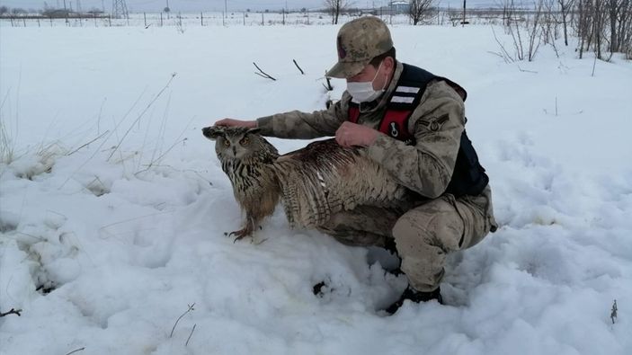 Malatya'nın Doğanşehir ilçesi Söğüt Mahallesi kırsalında yaralı ve bitkin halde yerde duran puhuyu fark eden jandarma ekibi, kuşa yem ve su verdi.