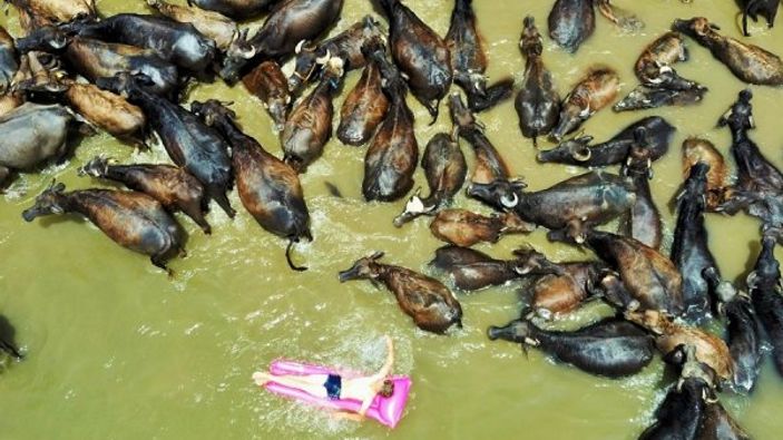 Burada yaklaşık 3 saat mandaları suda bekleten çobanlar da suda yüzerek eğlenceli vakit geçiriyor.