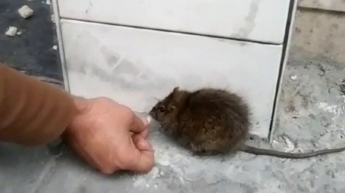 Manisa'daki Turgutlu ilçesinin Altay Mahallesi'de bulunan Tınaztepe Sokak’ta reklam tabela işleri yapan Veli Vural, sokak kedileri için ekmek bıraktığı dükkanının önünde, bir süre önce fare gördü.
