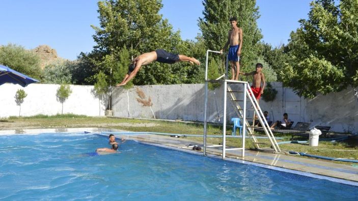 Sıcaklığın 45 dereceyi aştığı Kızıltepe'de vatandaşlar, Gurs Vadisi'nde kurulan yüzme havuzunda serinlemeyi tercih etti.