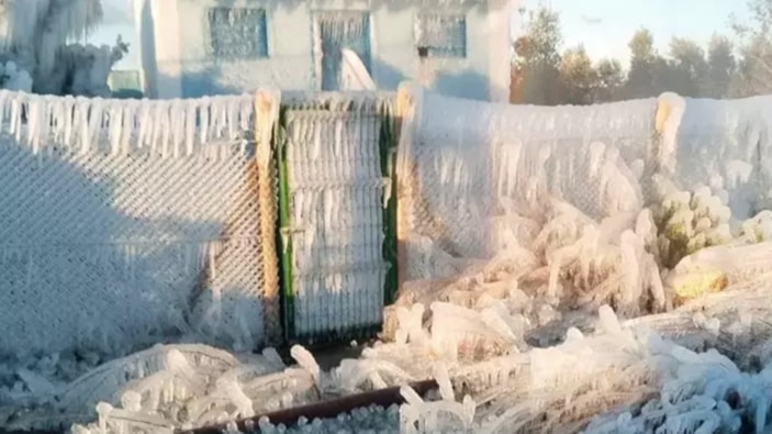 Mersin'in Erdemli ilçesinde patlayan sulama borusundan akan su, soğuk hava ile birlikte donunca ortaya ilginç manzaralar çıktı.
