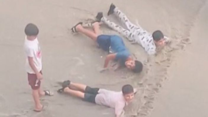 Cep telefonu ile çekilen görüntülerde yağmurla oluşan akıntıyı eğlenceye dönüştüren çocuklar, ailelerinin ikazına rağmen yoldaki su birikintilerinin içinde yuvarlanarak serinliğin tadını çıkardı.