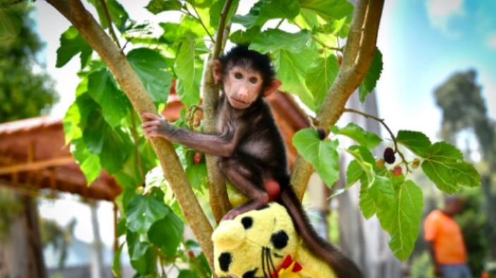 Mersin'deki Tarsus Doğa Parkı'nda doğan ancak annesi kabul etmeyince kuvözde büyütülen babun maymunu Nisan, veterinerlerce doğal ortamına alıştırılmaya çalışılıyor.
