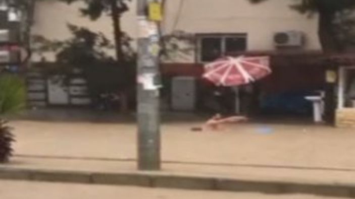 Cep telefonu ile kaydedilen ve sanayi sitesi bölgesinde çekildiği tahmin edilen görüntüde, bir şahıs soğuğa rağmen üzerini çıkarak sel sularında yüzdü. Plastik leğenden tekne yapan ve 'makarna' adı verilen yüzme aleti ile sel sularının oluşturduğu akıntıya kendisini bırakan şahıs, yağmurun tadını çıkardı.