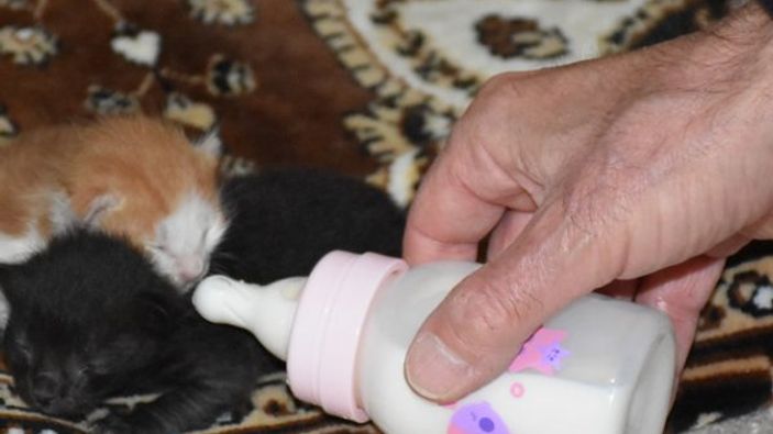 Yılmaz, annelerinin bırakıp gittiği kedi yavrularını temizledi, bakımlarını yaptı ve uyumaları için seccadenin üzerine yatırdı. Kedilere düzenli olarak biberonla süt veren Yılmaz, hayvanlara büyük bir şefkatle yaklaşıyor.
