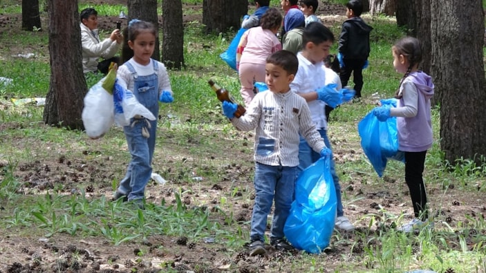 Erzurum’da anaokulu öğrencileri, Atatürk Üniversitesi kampüsündeki ağaçlık alanda çevre temizliği yaptı. Naylon poşetler, sigara paketleri ve içecek kutuları gibi atıkları poşetlere toplayan çocuklardan Ömer Asaf Ay, “Doğayı iyileştirmek için buradayız. İki poşet dolusu çöp topladım” dedi.