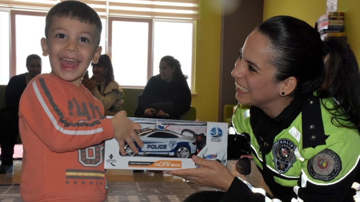 Muğla'da trafik polisleri, depremlerden etkilenen çocuklara yönelik etkinlikler düzenleyerek oyuncak dağıttı.