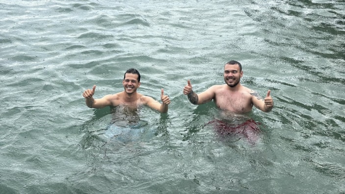Doğancan Akyel ile Enes Türker, İçmeler Sahili'nde kuvvetli sağanağa rağmen iskeleden suya atlayarak denize girdi.