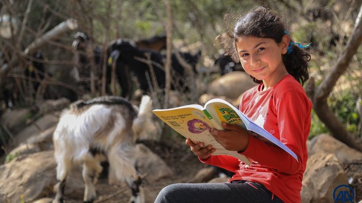 Muğla'jın Milas ilçesindeki Sodra Dağı'nın eteklerine kurdukları çadırda yaşayan 4. sınıf öğrencisi Cennet Medine Günendi, bir yandan hayvanlarla ilgileniyor, bir yandan da koronavirüse rağmen eğitimini aksatmıyor.