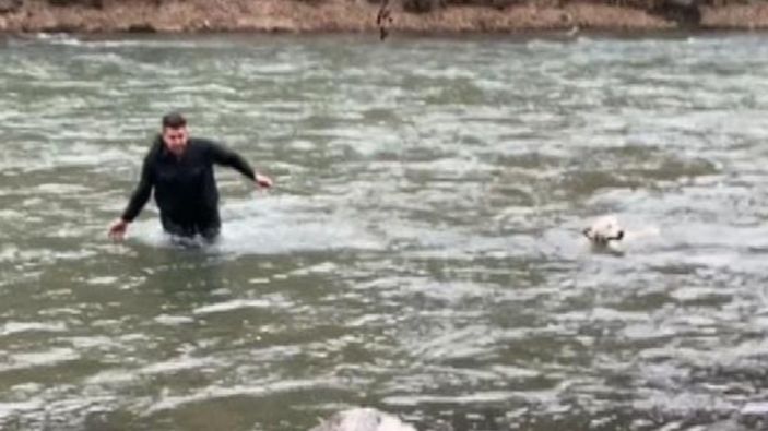 Tunceli'de tasmasının taşa takılması sonucu su kıyısında mahsur kalan köpek, debisi yüksek ve dondurucu Munzur Çayı'na atlayan Gürkan Yılmaz tarafından kurtarıldı.