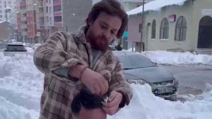 Kent merkezinde dükkanına gelen müşteriyi karlı havada, iş yerinin önüne koyduğu sandalyede tıraş eden berber, o anları kayıt altına aldı.